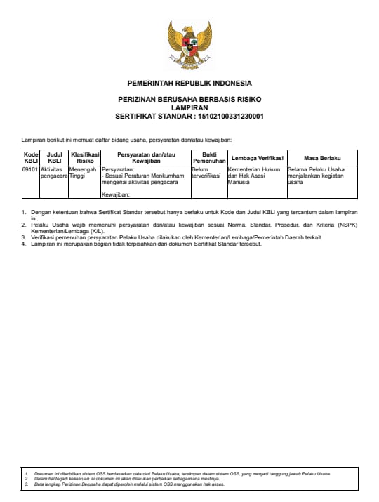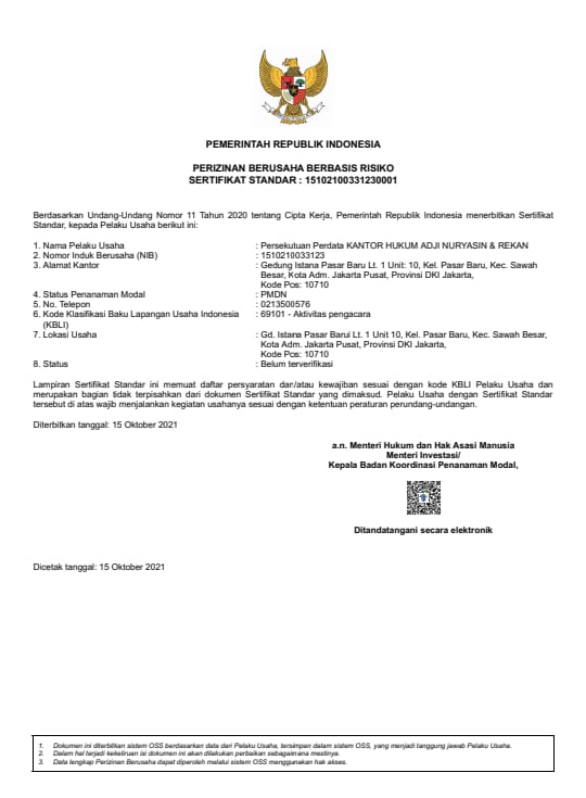 - Nomor Induk Berusaha (NIB) OSS RBA Kemenkumham RI Nomor 1510210033123 Kode KLBI 69101 Tanggal 15 Oktober 2021;